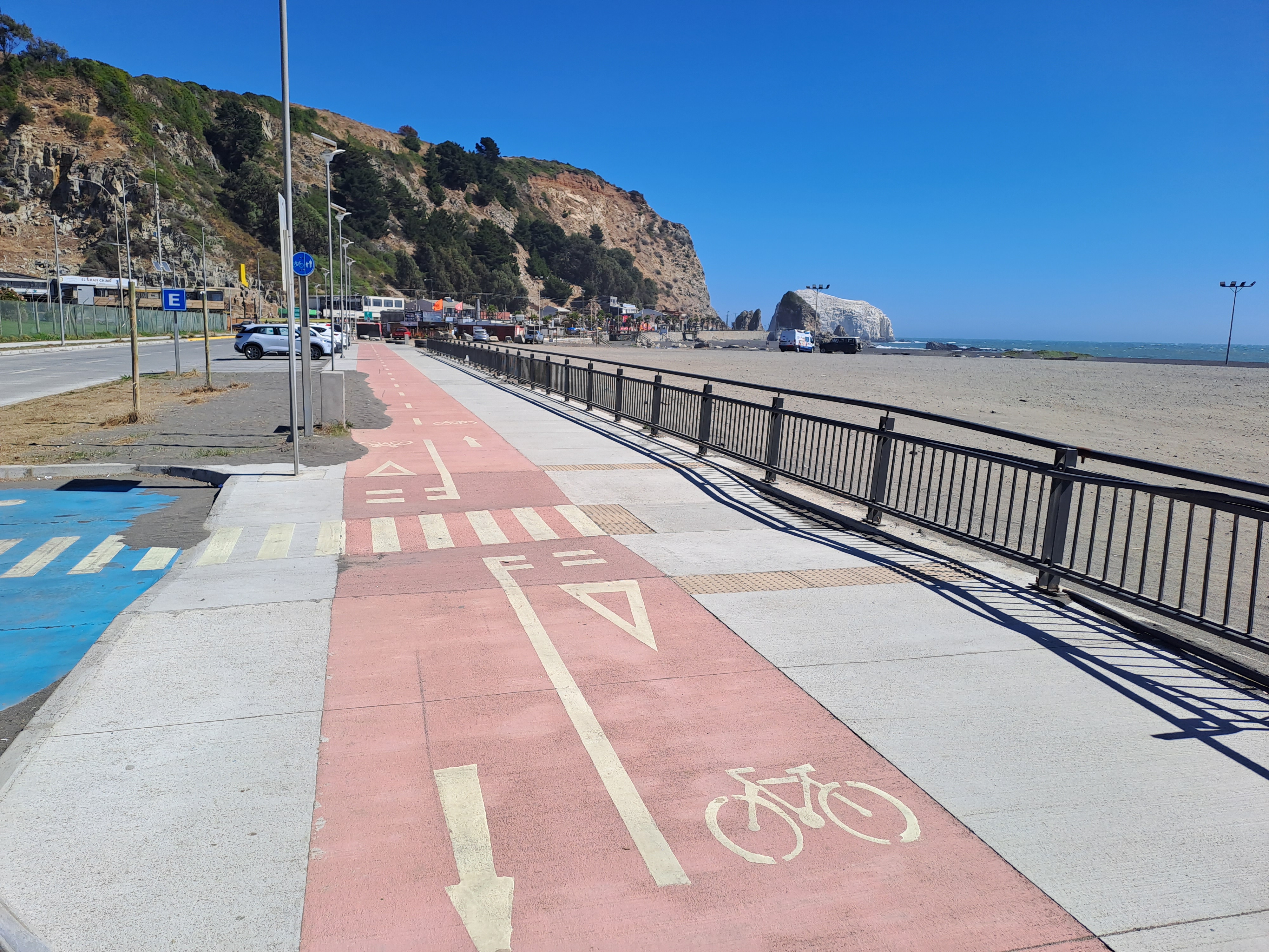 El borde costero ofrece un extenso recorrido sin daños estructurales, con vista directa al mar y dos miradores, uno de ellos accesible. La costanera cuenta con rampas hacia la playa, asientos distribuidos y zonas deportivas inclusivas, adaptadas también para personas en silla de ruedas.